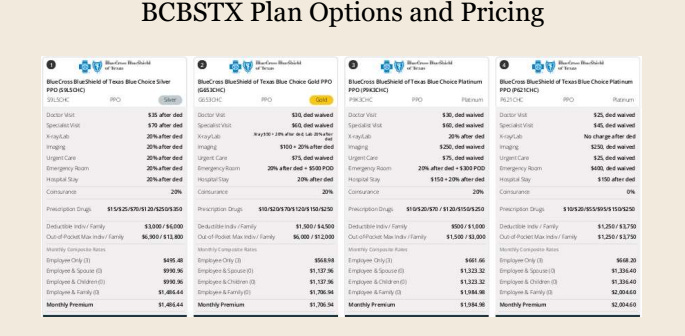 When you get your medical quote or proposal back from your broker, PEO or online request, you’ll likely be presented with some form of this chart, among many other bits of info but the side-by-side plan options and pricing chart is where you’ll want to start your review.